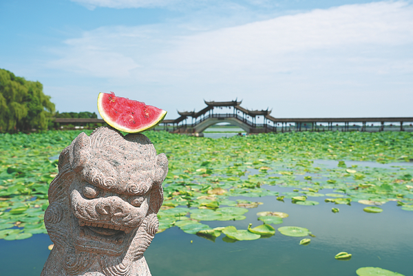 Cicadas may stridulate on, but the woods sound even quieter, as a Chinese poem goes. In muggy summer afternoons, dragonflies hover low, preying over a pond in the middle of outspreading green lotus leaves. Fragrant lotus flowers, in bud or blooming, stand gorgeously upright in pink or white. Down in the water, fish swim on the surface gulping for air.