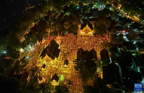 Drone footage shows people lighting lanterns in the ancient city of Luang Prabang in  Laos. [Photo/by the Xinhua News Agency]