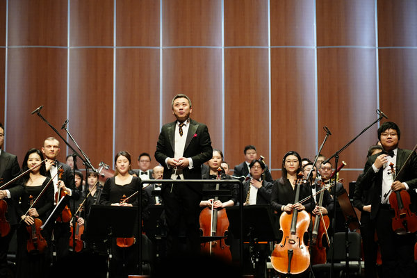 Under the baton of conductor Jin Gang, the symphony orchestra of China Conservatory of Music staged a concert marking the Spring Festival in Beijing. [Photo provided to China Daily]