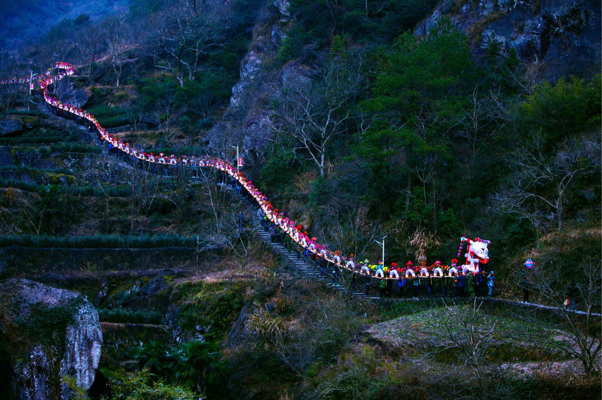 After offering sacrifices to the spirits, the dragon lanterns formed with benches descend from the mountain and performs a dragon dance in Jinyun county, Zhejiang province. Photography by Tian Xiaoping