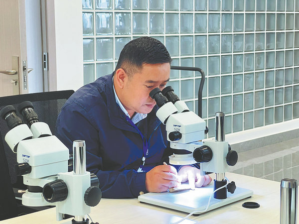 Guo Jin, deputy director of the Chengjiang Fossil Site Natural History Museum in Yuxi, Yunnan province, examines a fossil at the museum. [Photo provided to China Daily]