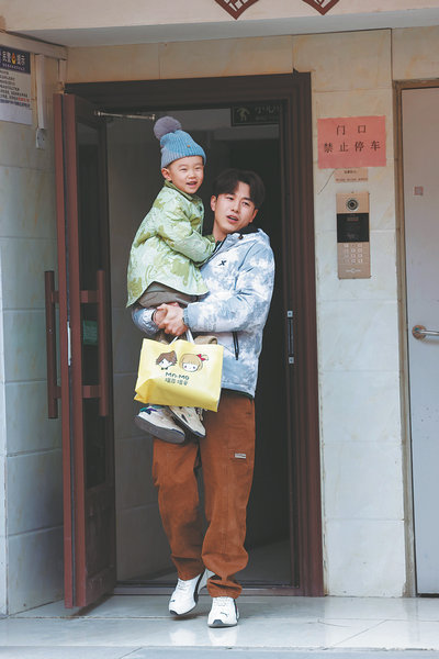 Holding his son, sailor Zhao Zhiyuan, who used to spend most of his time at sea, takes on the role of a full-time dad in the reality show, Father in Charge. [Photo provided to China Daily]